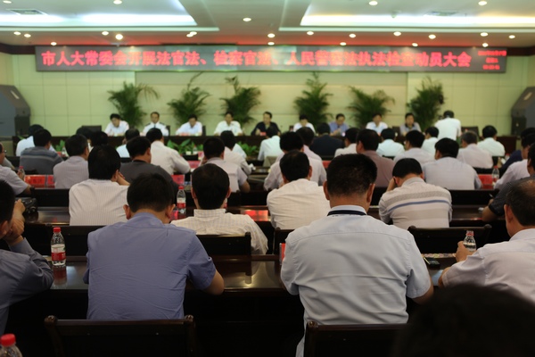 会上,市人大常委会秘书长陈民政宣读了“三官法”执行检查实施方案,市公、检、法、司机关主要负责人作表态发言。