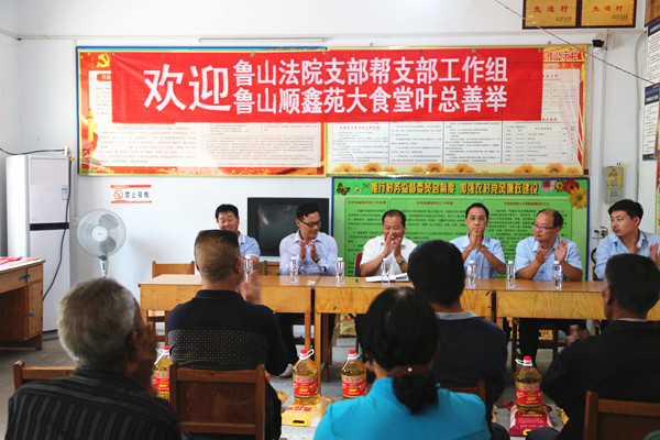 2017年9月28日下午,鲁山县法院脱贫攻坚中汤法庭党支部帮扶小组联系帮扶的下汤镇尹和庄村村委院内,热闹非凡。原来是鲁山县爱心企业家、顺鑫大食堂总经理叶某春为该村送来了2000元现金及大米、食用油等生活用品,总价值3200余元,表达了对贫困群众的一份沉甸甸的情谊。下汤镇人大主席高峰,鲁山县法院党组成员、政治处主任赵全文等出席捐赠仪式。